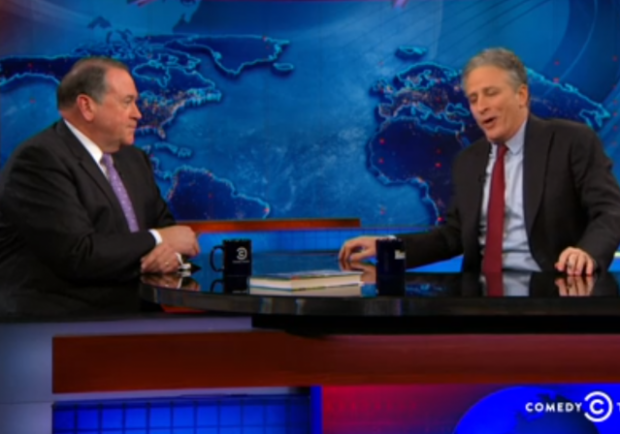Mike Huckabee joined Jon Stewart on The Daily Show to chat about his new book, God, Guns, Grits, and Gravy. Huckabee recently quit Fox News, suggesting he will toss his hat into the Presidential arena.