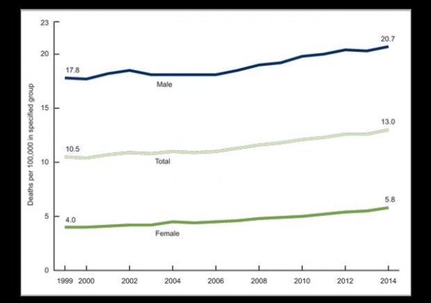 Those statistics are all about increase vs. decrease rather than absolute numbers, however. A caveat is that 1999, the start year, was a low year for suicides. But the rates have been steadily increasing since then, so it seems to be a real effect. The other thing I need to point out is that even though the rates among women increased more than among men, men have a much higher suicide rate than women: