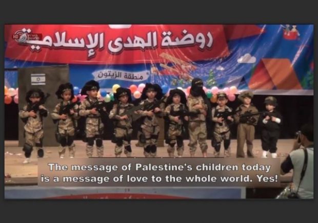 MEMRI has another recent example, Terror Show at a Gaza Kindergarten Graduation Ceremony; Islamic Jihad Leader to Israelis: We Are Not Terrorists, Don’t Force Us to Kill You, as reported below by Israeli TV (h/t @RedsWhinez Twitter):