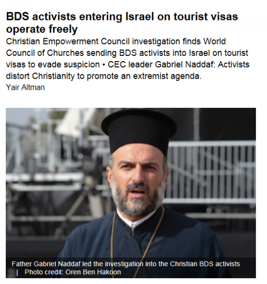 The Israeli Christian Recruitment Forum led by Father Gabriel Naddaf, spiritual leader of the Aramean Christian community in Israel, reportedly had sent information to the Interior Ministry which exposed Phiri as an executive for the WCC who was traveling to Israel to consult with church leaders at the Ecumenical Accompaniment Programme in Palestine and Israel (EAPPI)—a WCC-supported group that promotes boycotts and “demonizes Israel under the purported guise of ‘peace activists’.”