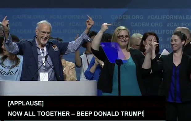 The anti-Trump fervor we’ve been documenting is not limited to college campuses, the mainstream media, and well-organized and -funded leftist organizations. The unhinged hatred for our president most recently manifested at California’s Democratic Party Convention where its chairman, John Burton, raised his middle finger and lead a chant of “F*%! Donald Trump.”