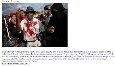 The caption on the photo says: “Supporters of ousted Honduras’ President Manuel Zelaya, one of them with a shirt covered with blood, talks to people next to a bullet-riddled motorbike outside the Toncontin international airport in Tegucigalpa July 5, 2009.”