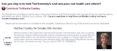 Added: MoveOn.Org wants to help save health care reform by electing Coakley, but MoveOn is against the Senate health care bill which Coakley supports! Oh, the irony.