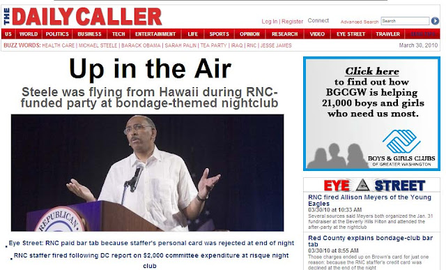 It's first major original story is the saga of some poor sap who got caught with the bill when some RNCers went to a sexually-themed strip club (horrors!), and then sought RNC reimbursement. The article was written dishonesty, to strongly imply that Steele went to the club, along with other personal expenses falsely attributed to Steele himself. When called out on the dishonesty, Tucker Carlson tried to lie his way out of it, denying all error. And now most comments on his own site on this matter express frustration with Tucker's lack of candor.