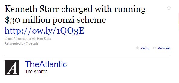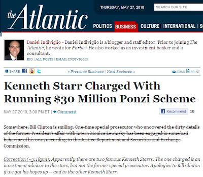 The Atlantic Magazine thought it would be able to speak poetic historical justice, by splashing the headline that the original reviled one, Kenneth Starr of Monica and Bill and Blue Dress and Impeachment fame, had been arrested for running a Ponzi Scheme.