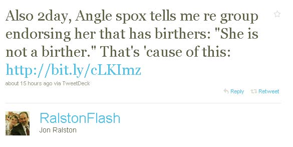 Angle’s campaign has denied sharing the group’s views on Obama’s citizenship, as the Nevada reporter has noted (Sargent’s post is the link in the tweet below):