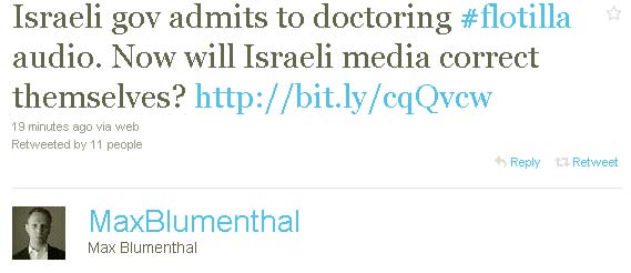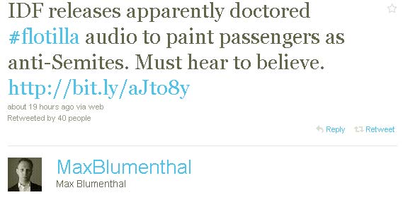 The IDF’s propaganda is increasingly unbelievable, yet the media is enthusiastically playing along. This audio, which purports to show flotilla passengers telling the IDF to “go back to Auschwitz,” appears to have been doctored by the IDF General Press Office or someone connected to it.