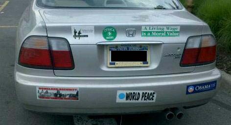 Yes, I do wonder what goes through the minds of people with cars like that. I am a frequent visitor to ithaca and witness those bumber stickers often. Coexist, is also a rainbow and unicorn mentality. But, I must say that the last time I was there I saw a car with bumper stickers that made me think I was in Texas! I do see the 1/20/2013 stickers every now and then.