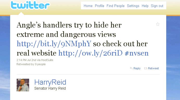Update: On July 2 the Reid campaign circulated a Twitter message which purported to direct people to Angle’s “real website” but actually directed them to the spoofed website (now redirected to “Sharron’ Angle’s Underground Bunker” website run by the Nevada Democratic Party):