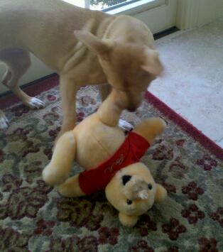 You see, Lola hates the Teddy Bear (photo upper right). We didn’t teach her to hate the Teddy Bear, so it was not learned. She also has plenty of other toys, so clearly she has the mental capacity to distinguish between love (her pull toy) and hate (the Teddy Bear).