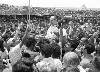 It's a small detail but I don't generally trust BBC when it comes to accuracy about Israel. In 1976, Begin was in opposition and would have had little, if anything, to do with the decision-making about Entebbe. I seem to recall similar celebratory pictures after the Iraqi reactor raid in 1981 – that took place in the midst of a tight election campaign and, hence, good reason for Prime Minister Begin to be present at an emotional outdoor rally after the news was announced.