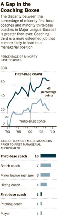 Among baseball’s 30 teams, only 23 percent of the third-base coaches are members of minorities, compared with 67 percent of its first-base coaches. The disparity has existed for decades but it is now about twice as large as it was in 1990, based on an analysis by The New York Times.