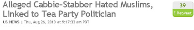 Since it appears that Anti-Muslim Cabbie Stabber Michael Enright had no connection to anti-Cordoba mosque groups, you knew the disappointed ones would search long and hard for a Tea Party connection.