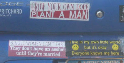 I'm pretty sure she's just someone who thinks she's funny; or rather, someone who thinks those bumper stickers are funny. If she really hated men as much as some of those stickers suggest, then she wouldn't have some of the others on there.