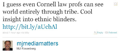 In response to my post calling out leftist Jewish bloggers for stoking charges of dual loyalty againt American Jewish supporters of Israel, M.J. Rosenberg of Media Matters (one of the bloggers mentioned in my post) tweets that I’m just a tribalist: