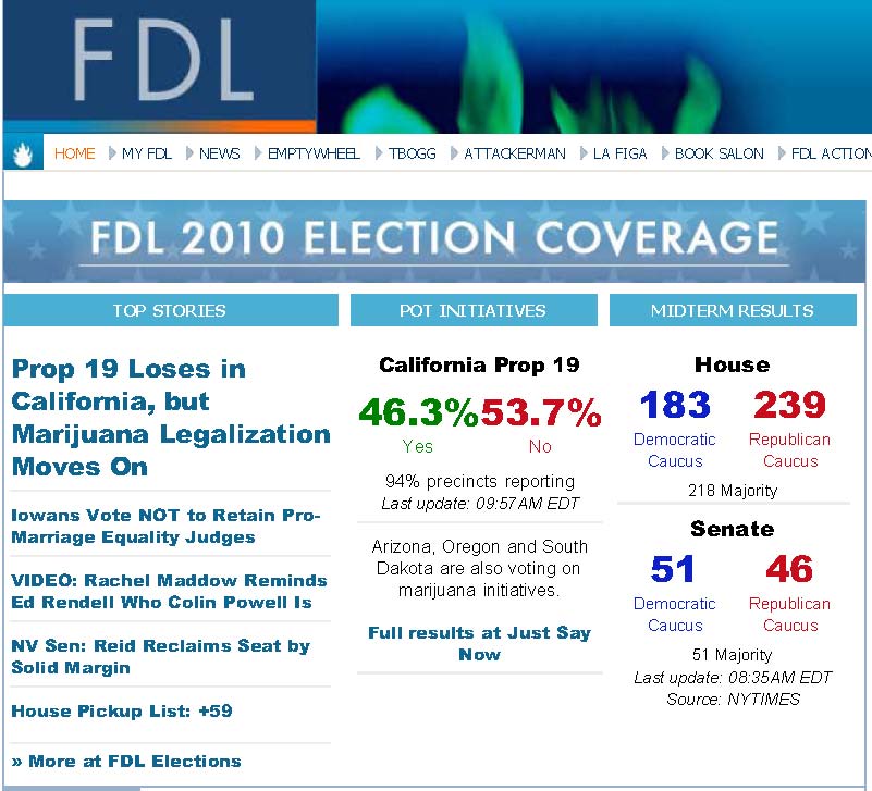 Homepage report at Firedoglake on last night’s elections. Dems wiped out in the House, serious setbacks in the Senate, Statehouses gone … but damn it, they defeated California Prop. 19, a “they took the bar” moment if ever there were one: