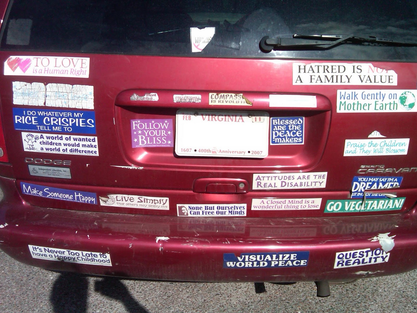 Identify the partially removed bumper sticker on the window to the left of the wiper, and the crackled bumper sticker second from the top on the left.