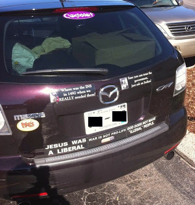 More proof for the bumper sticker rule: One bumper sticker means the driver has an opinion, more than one means the driver is a kook!