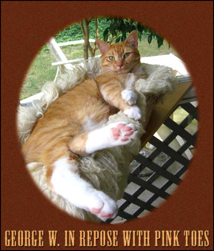 “I thought I’d refudiate that awful bumper sticker you currently have on your blog. Below is a picture of our beloved cat whose full name was George W. Bush Leader of the Free World. I insisted his complete name be recorded at our vet’s office in Marietta, GA. Interestingly, we adopted him in the summer of 2000 and my vet told me then that our George was the fourth or fifth cat/patient with a variation of the same name. We lost GWB two years ago on the Fourth of July, 2007. The photo below is my favorite picture of him, capturing his blasé yet totally in-control personality. He weighed 15 pounds had big bright green eyes and a very sexy swagger, plus those terribly cute pink toes.”