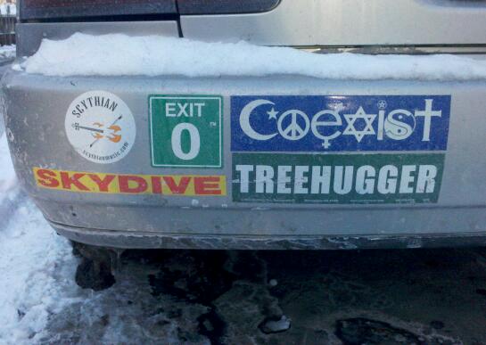 Spotted in Ithaca this morning, a pretty unusual combination of bumper stickers.