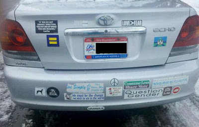 Uh hum. I might point out that the crazy granola sticker has an OHIO license plate. We gots no Whole Foods around here but we gots lotsa wackadoodles.