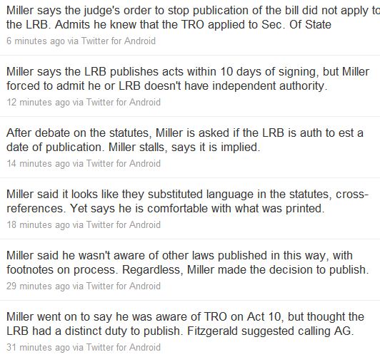 JSOnline – Testimony by a witness from the Legislative Reference Bureau (LRB) to the effect that the LRB was directed by Scott Fitzgerald, the Republican Senate leader, to publish the budget repair bill.