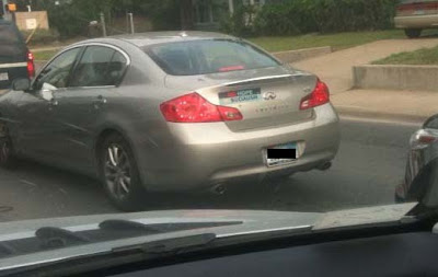While I would have liked a close up, I do appreciate when my readers heed my caution about driving while photographing bumper stickers. But a zoom lens wouldn’t kill ya.