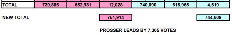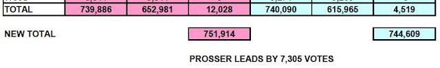 At that point, the statewide total showed that Prosser was up by 7,322 votes. She had to make up the difference somewhere in that mix of three counties being "worked on."