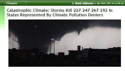 This week Think Progress hit a new low, when it ran a blog post mocking the politics of southern states which were hit by tornadoes, using the devastation as an excuse both to push a global warming agenda and to take a swipe at the conservative politics of the region.