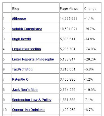 So I am pleased to present the latest rankings of law professor blogs via TaxProf for the trailing 12 months ending March 31, 2011 (drop everyone by one spot since Instapundit no longer is on the list because it stopped showing its Sitemeter):
