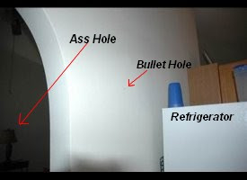 The bullet did NOT “go into the ceiling” until it had sped past his head, through the wall behind him, entered the NEXT room, and THEN struck the ceiling. That’s some “warning shot,” eh? Even HAD she fired into the ceiling directly above her head, there’s no evidence of which I’m aware that would make such an act reasonable under the circumstances.
