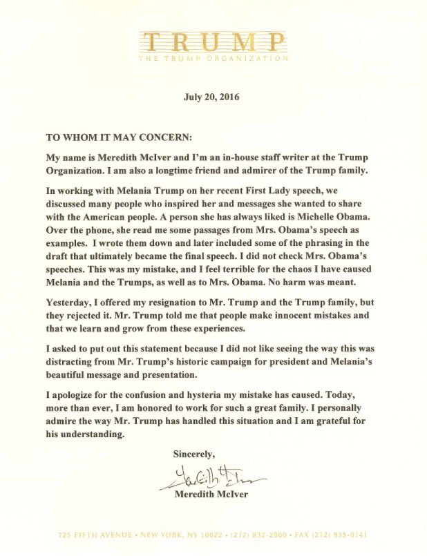“The ridiculous allegations against Mrs. Trump of plagiarism from a speech Mrs. Obama did not write have already been debunked…”