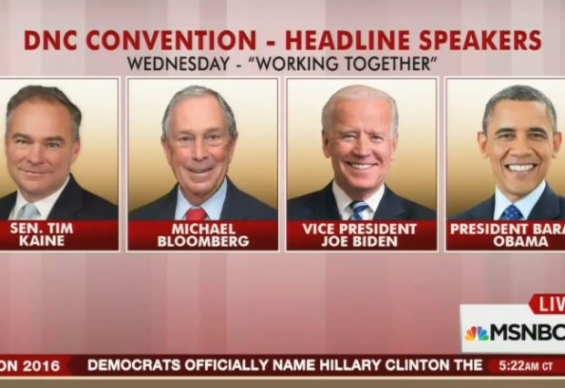 But it wasn’t just Obama’s as yet unspoken speech that had Scarborough excited. “You look at that lineup: it’s absolutely extraordinary,” enthused Joe. In addition to Obama, tonight’s line-up consists of Michael Bloomberg, Tim Kaine and Joe Biden. Yes, when it comes to oratory that will bring people to their feet, set their pulses racing and forever claim that they were there in the hall that night, there’s nothing like Mike Bloomberg bragging about the day he banned the Big Gulp.