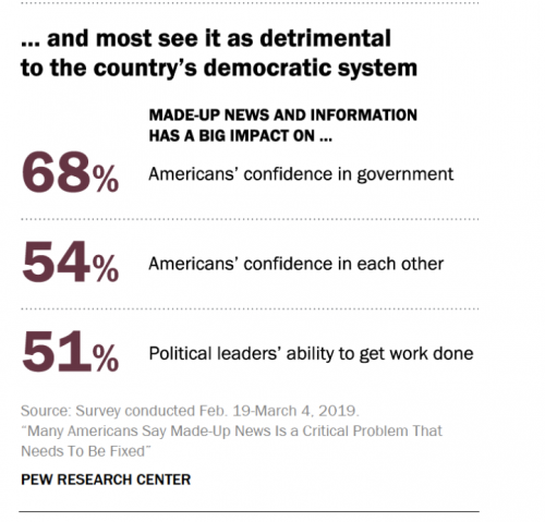 Indeed, more Americans view made-up news as a very big problem for the country than identify terrorism, illegal immigration, racism and sexism that way. Additionally, nearly seven-in-ten U.S. adults (68%) say made-up news and information greatly impacts Americans’ confidence in government institutions, and roughly half (54%) say it is having a major impact on our confidence in each other.