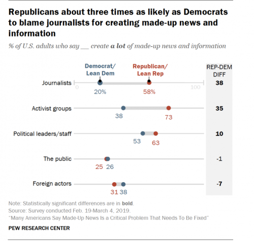U.S. adults blame political leaders and activists far more than journalists for the creation of made-up news intended to mislead the public. But they believe it is primarily the responsibility of journalists to fix the problem. And they think the issue will get worse in the foreseeable future.