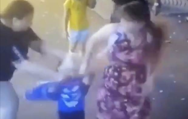 Of course, all that once again changes very quickly, as the attacker suddenly turns back to the bewildered parents who are still processing what’s happened, at about the 6.20s mark of the video: