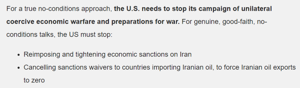 [CodePink insists that American sanctions of Iran should be rolled back completely. Screenshot from CodePink website, October 2019.]