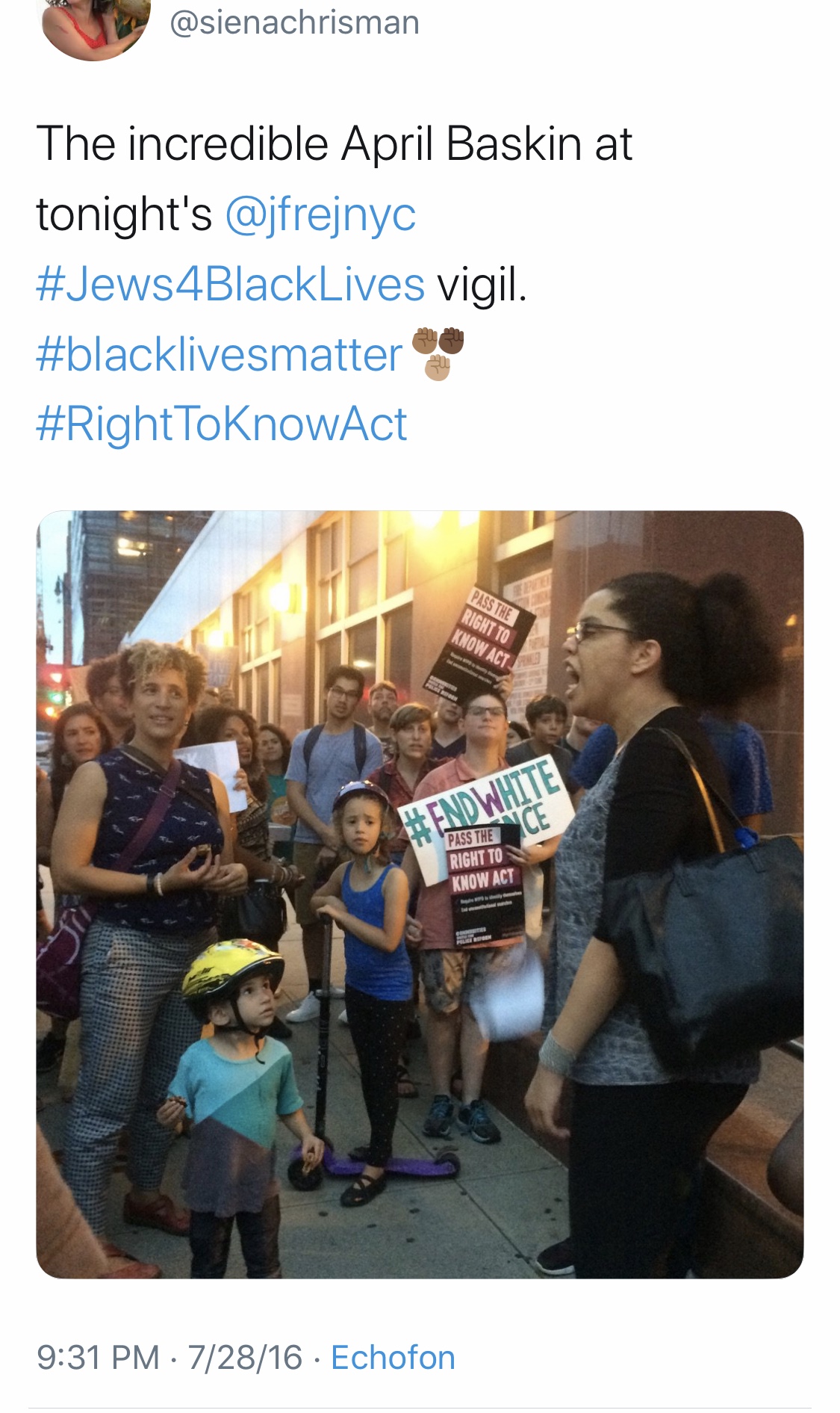 - April Baskin speaks at the 2017 March 4 Racial Justice NYC. Other speakers included Tamika Mallory and Linda Sarsour. JFREJ and Jewish Voice for Peace were among the supporters of the March.