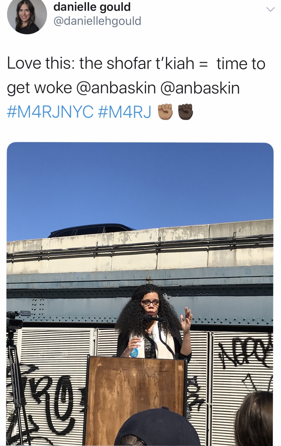 “I noticed at times when controversies around the Women’s March happened… people retreat back to their own communities, especially within the Jewish community. I implore you from a really personal place…like I could start crying but I won’t…Especially for those of us who are inherently a part of multiple communities who feel like we don’t have a choice when you retreat back it leaves us in the wind. We know it’s not an intentional betrayal, but it is extremely isolating and terrifying to be alone in this [social justice] work.”