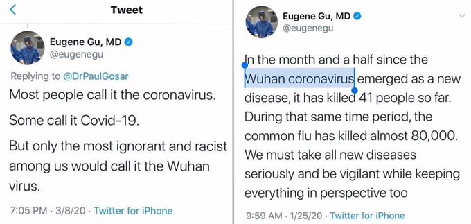https://twitchy.com/samj-3930/2020/03/10/so-hes-ignorant-and-racist-ha-woke-dr-eugene-gu-reaps-ratio-whirlwind-for-his-wuhan-virus-is-racist-self-own/