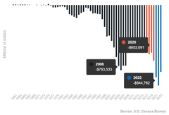 Infuriating. Every year of the Biden administration saw a greater trade deficit than any of Trump’s term. The previous high was in 2006.