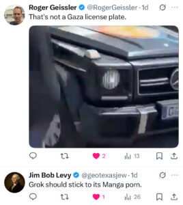 My mutuals, Roger Geissler and Jim Bob Levy, joined the conversation. Geissler pointed out that the license plate on the car is not from Gaza and Levy said ”Grok should stick to its Manga porn” — in reference to the slightly disturbing and hugely disappointing videos Elon has been posting in recent weeks.