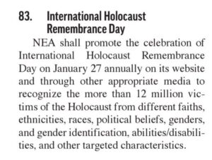 “NEA shall promote the celebration of International Holocaust Remembrance Day on January 27 annually… to recognize the more than 12 million victims of the Holocaust from different faiths, ethnicities, races, political beliefs, genders, and gender identification, abilities/disabilities, and other targeted characteristics.”