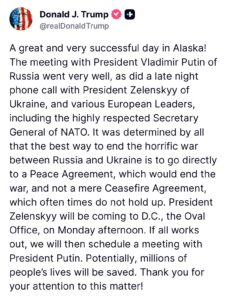 “A great and very successful day in Alaska! The meeting with President Vladimir Putin of Russia went very well, as did a late night phone call with President Zelenskyy of Ukraine, and various European Leaders, including the highly respected Secretary General of NATO. It was determined by all that the best way to end the horrific war between Russia and Ukraine is to go directly to a Peace Agreement, which would end the war, and not a mere Ceasefire Agreement, which often times do not hold up. President Zelenskyy will be coming to D.C., the Oval Office, on Monday afternoon. If all works out, we will then schedule a meeting with President Putin. Potentially, millions of people’s lives will be saved. Thank you for your attention to this matter!”