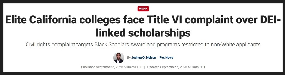 He went on to say, “Creating educational opportunities based on race, color, national origin, or sex violates Titles VI and IX of the Civil Rights Act, as well as state law. Such scholarships also violate the non-discrimination policies of the institutional members of the Claremont Colleges. We are asking the Claremont Colleges and its institutional members to live up to the law and their own rules, and remove the discriminatory eligibility barriers.” ….