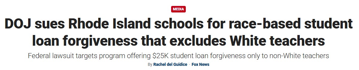 The Department of Justice filed a lawsuit today against the Rhode Island Department of Education (RIDE) and the Providence Public School District (PPSD) over their “Educators of Color Loan Forgiveness Program” (Program) through which new PPSD teachers who identify as “teachers of color” can receive up to $25,000 in student loan forgiveness while only white teachers are excluded from the Program.