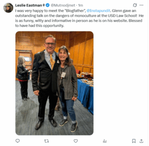 Last night, I was privileged to meet Professor Glenn Reynolds before his talk given as part of the 2025 Bowes-Madison Distinguished Speaker Series Lecture at the University of San Diego School of Law.