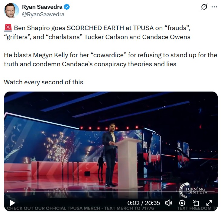 Ben Shapiro gave an impassioned speech at TPUSA’s Amfest 2025, to a huge positive reaction from those in the audience and across the political spectrum – with the exception of the Tucker Carlson and Candace Owens wing of politics, and as well as with Megyn Kelly, all of whom were mentioned in Shapiro’s speech as part of or at least coddling the conspiracy theories that threaten to destroy conservatism.