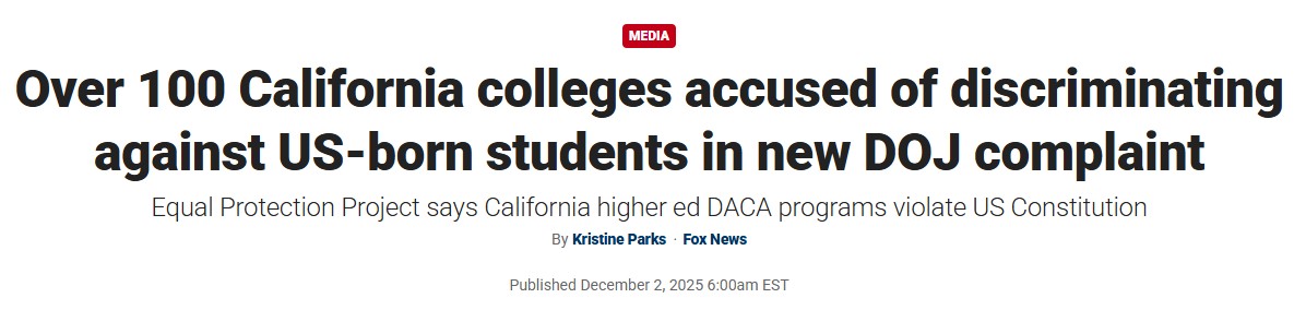 Our Equal Protection Project has challenged over 125 institutions regarding over 600 discriminatory programs and scholarships. You may recall that, based on our civil rights complaints in July 2025, the U.S. Department of Education opened investigations into DACA/”Undocumented” Only programs at five universities, leading to an avalanche of media coverage.