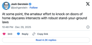 Josh Gerstein of Politico is facing an avalanche of critical responses on Twitter/X over a post he published on Monday night in which he implied that Somali daycare centers might start justifiably shooting people for knocking on their doors and asking questions, under ‘Stand Your Ground’ laws.